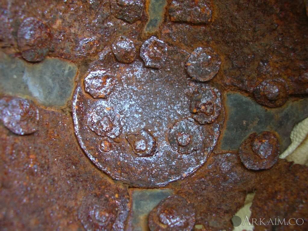 Вестготский шлем, типа Spangenhelm, относящийся к 5 веку н.э.. Шлем сделан из четырёх медных пластин-рёбер, соединённых железными пластинами внутри. Рёбра имеют рельефные рисунки в форме латинского креста на двух противоположных рёбрах и пересекающиеся линии - образующие треугольники на других двух. Вверху шлем имеет навершие - медный диск. Есть и еще один железный диск - внутри шлема под медным диском. Внутри, под четырьмя заклепками, которые были использованы в качестве крепления подкладки, остались несколько фрагментов ткани, вероятно, хлопка или льна.