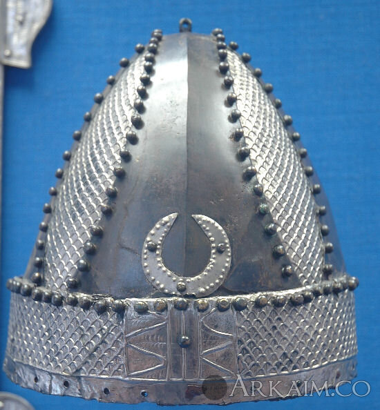 Это один из наиболее сохранившихся и украшенных Сасанидских шлемов, чья конструкция лишь незначительно пострадала от времени. Шлем был найден в могиле воина, на западе Ирана. Округлая форма купола шлема, уже несколько ниже предыдущих вариантов. С боков шлем представляется более округлой формы, чем спереди. Состоит из широких пластин-рёбер и обода. На переднем ребре присутствует украшение, в виде полумесяца. Рёбра скреплены с внутренними пластинами, заклёпками. Вся поверхность пластин, так же как и обода, рельефная, с углублениями в виде чешуек. В нижней части обода есть ряд отверстий для крепления кольчужной бармицы.