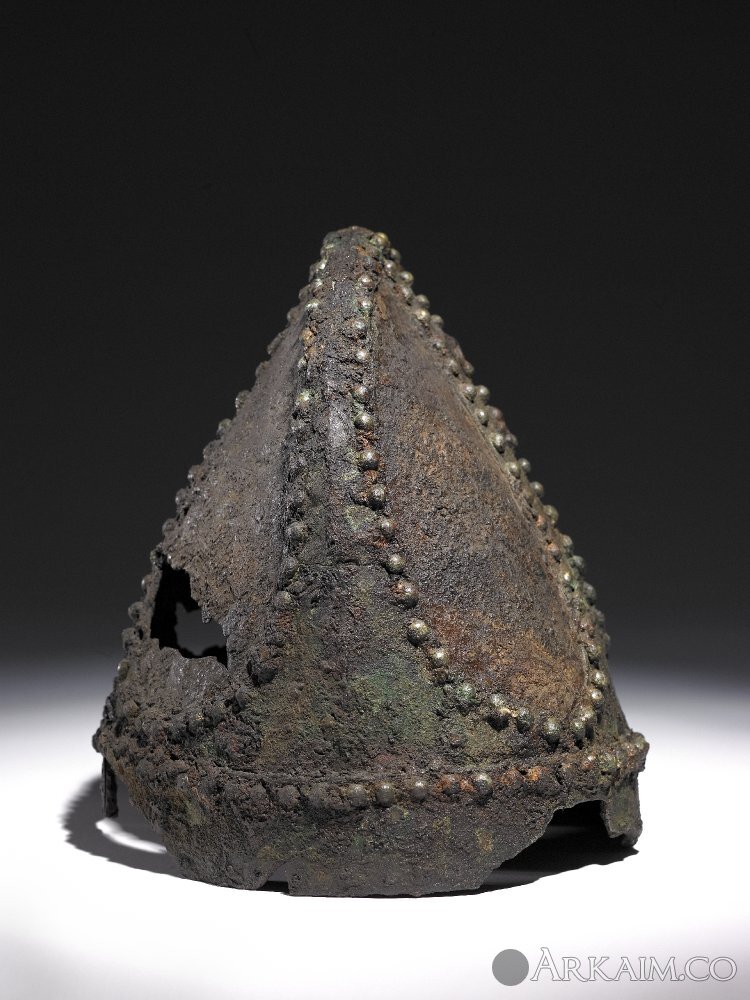 Yorik 88 Опубликовано 29 сентября, 2015 Один из четырех Сасанидских шлемов, найденных во время раскопок на холме Kuyunjik в Nineveh, Ирак. Размеры шлема, около: высота 20 см, основа: ширина 22 см, глубина 19 см. Купол шлема высокой округло-конической формы, с боков он представляется округлой формы, спереди же заострённой. Состоит из железных пластин, прикреплённых к внешним бронзовым пластинам-рёбрам и ободу (шириной 4 см). Заклёпки-шарики (0,7 см), расположенные в 0,3 - 0,5 см друг от друга, были изначально позолочены. Железные пластины сильно проржавели, но изначально они были покрыты тканью с внешней стороны, следы которой остались в продуктах коррозии. Есть следы второго ряда отверстий вокруг обода, с большим интервалом расстановки, но в них отсутствуют заклепки и всяческие следы другого прикреплённого железного кольца, и вероятно, служили не для крепления бармицы, а предназначены для кожаной подкладки.