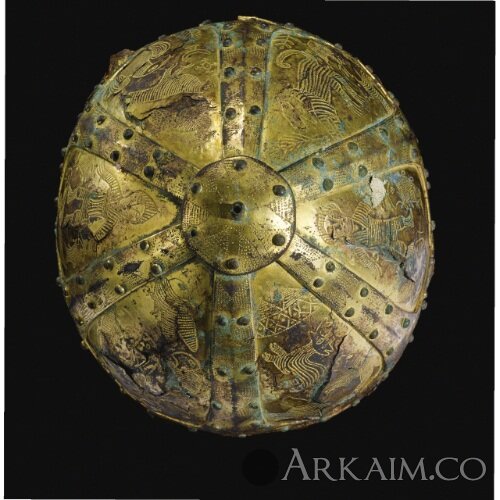 Шлем был найден в могиле, якобы в 1920-х годах на Кавказе (в европейской коллекции с 1970 года). Шлем отсутствует в Европейских каталогах. Купол шлема состоит из шести позолоченных, медных пластин-рёбер, которые к низу раздваиваются. Рёбра имеют рельефные рисунки в форме треугольников с линиями внутри. В промежутке между рёбрами установлены шесть позолоченных, железных пластин. Пластины имеют рисунки в форме различных животных, птиц, рыб, человеческих фигур и других узоров. Купол находится внутри железного кольца, покрытого позолоченным медным листом с рельефными рисунками в форме виноградной лозы, птиц клюющих виноград. Нижний край имеет ряд отверстий по всей длине, для крепежа подкладки. Вверху шлем имеет позолоченное медное навершие.