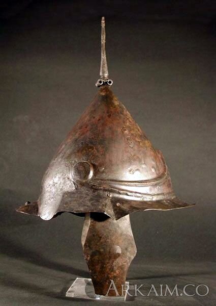 ЭЛЛИНИСТИЧЕСКИЙ железный шлем из Беотии типа Корона сужающийся к заостренной вершиной с шипом, с широким ободом, передняя литой с фасонной треугольника прокрутки в стилизованных завитков по обе стороны. Найден в Югославии (фото 2)