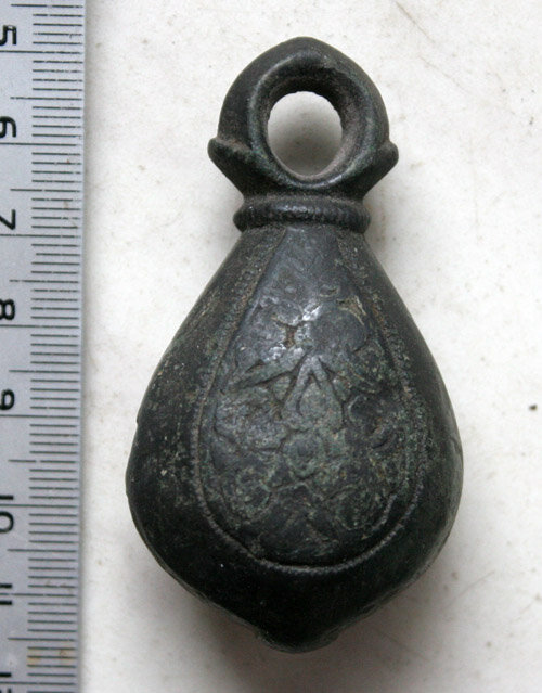 Кистень грушевидный уплощенный с черневым орнаментом, тип 3 по Кирпичникову, вторая половина 12 - 13 вв.
