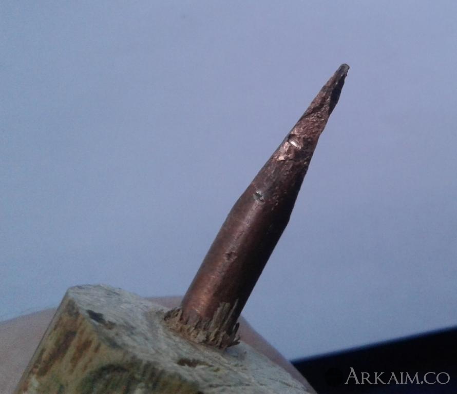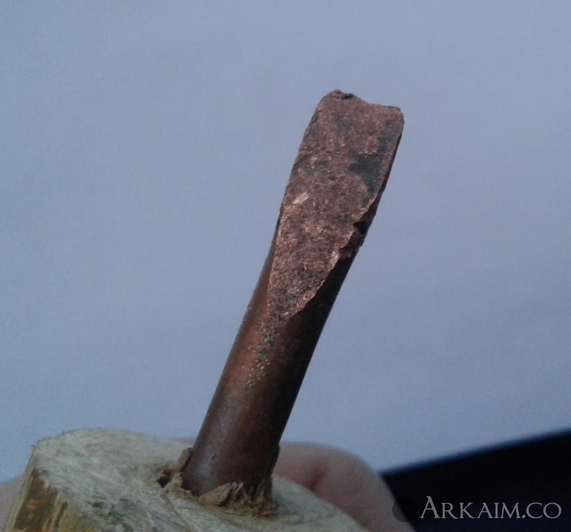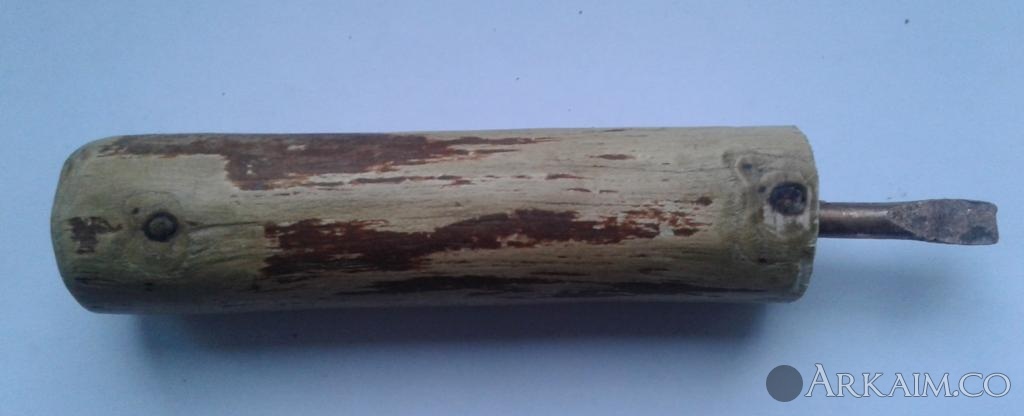 Вот, это мой инструмент (отжимник).... Сейчас окончание я ему обновил, отстучал, приострил. А до этого был такой же тупой, примерно как и ваш.... В процессе пользования он вдавился и вошел в рукоять почти весь..., еле его от туда вытянул.... Пришлось немного срезать деревянную рукоять, что бы подцепиться плоскогубцами.