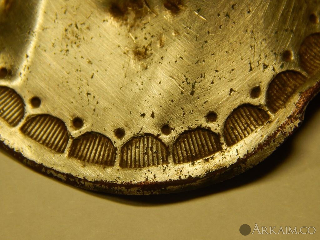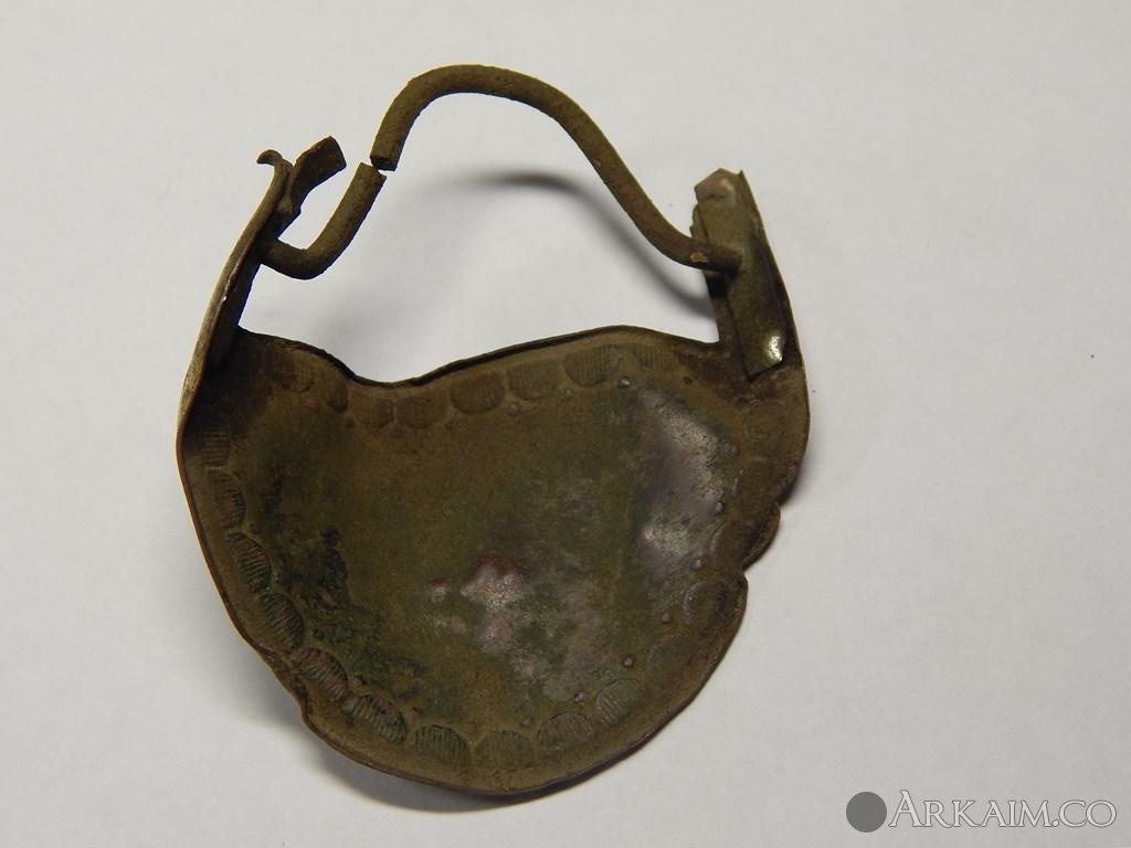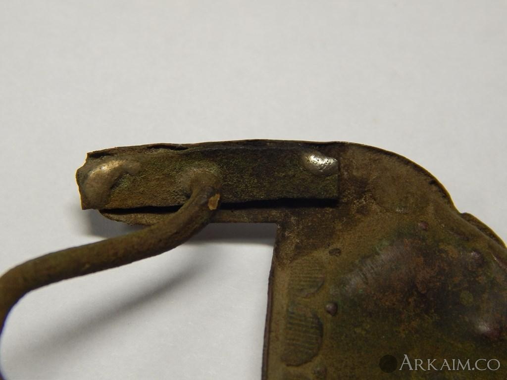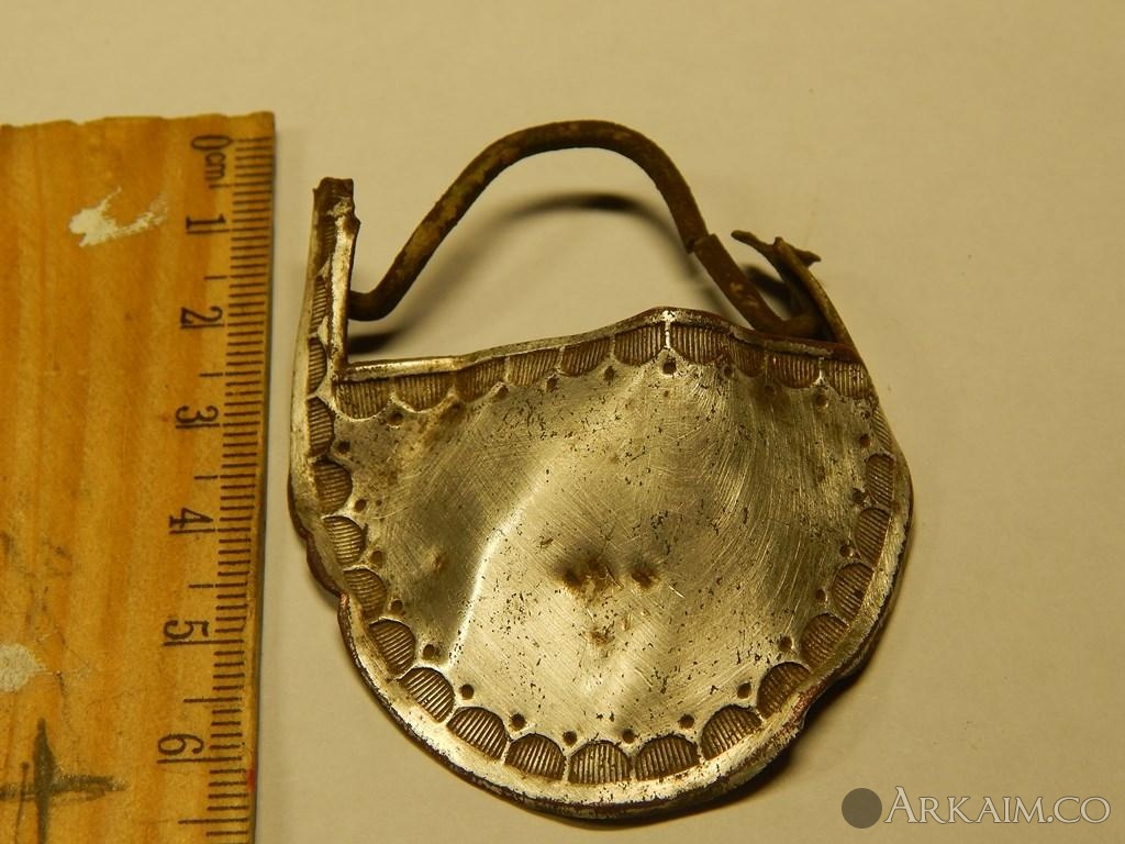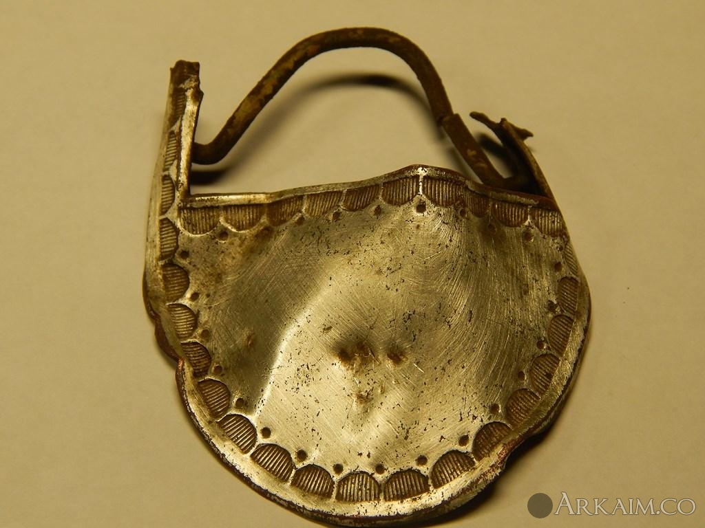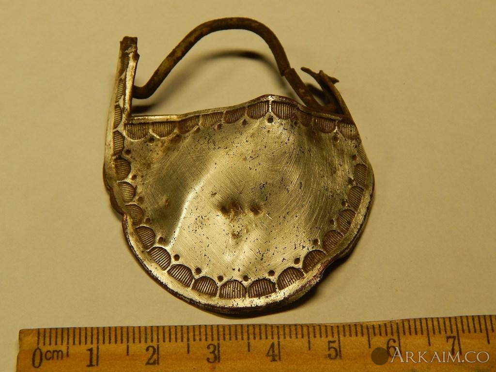 Материал бронза или медь, сверху посеребрение. Размеры 55Х60мм. Есть следы пайки. Найдена в лесу, где наложились разные культуры. В сопутке были стрелы, височное кольцо, акинак и сарматский меч, а также монеты 19 века, крышка от курительной трубки. Район находки - верховье речки Орельки.