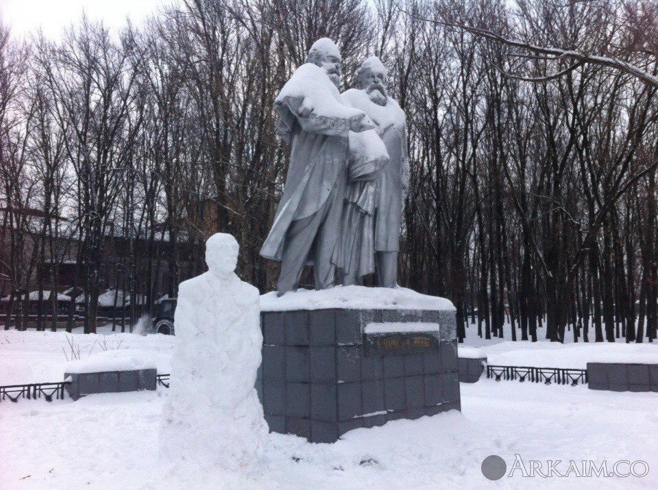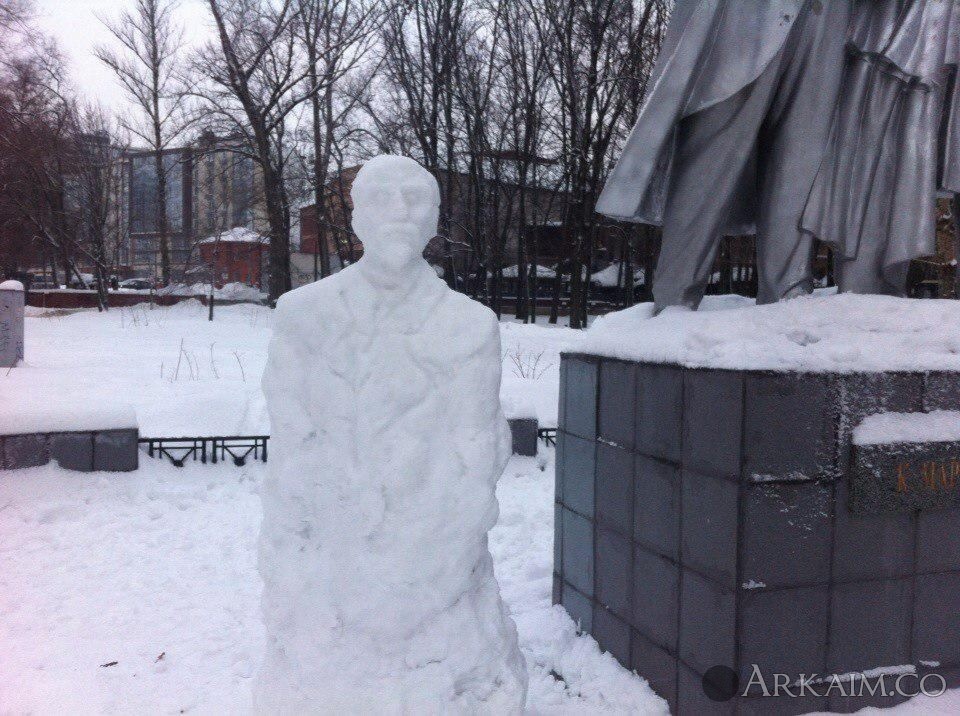 4. Неизвестный слепил Ленина из снега у памятника Марксу и Энгельсу в Белгороде В Белгородском центральном парке поселился Ленин из снега. Неизвестный ночью вылепил скульптуру вождя и установил рядом с памятником Марксу и Энгельсу. Теперь три главных идеолога марксизма-ленинизма воссоединились и радуют горожан в парке. Отметим, что неизвестный скульптор постарался воссоздать из снега все черты лица Владимира Ильича и даже сделал ему аккуратный пиджак.