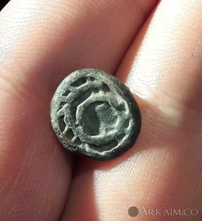 На Домонголе Юхновская культура (в крайнем случае очень похожа). Размер прибл. 3на 3см. Оловянистая бронза. Находка в районе зольника семАчного.