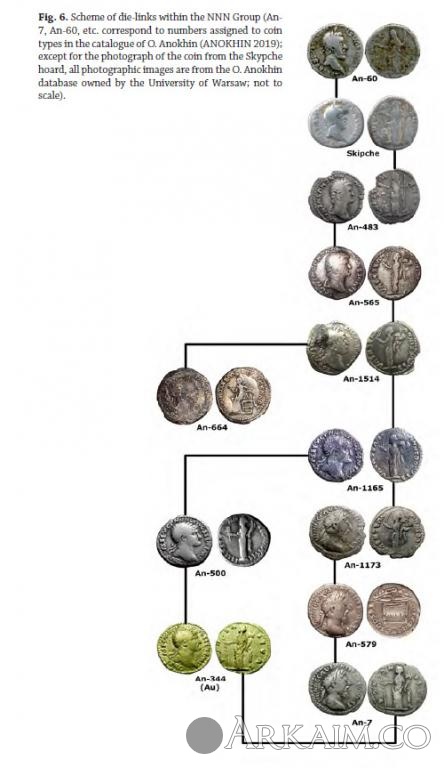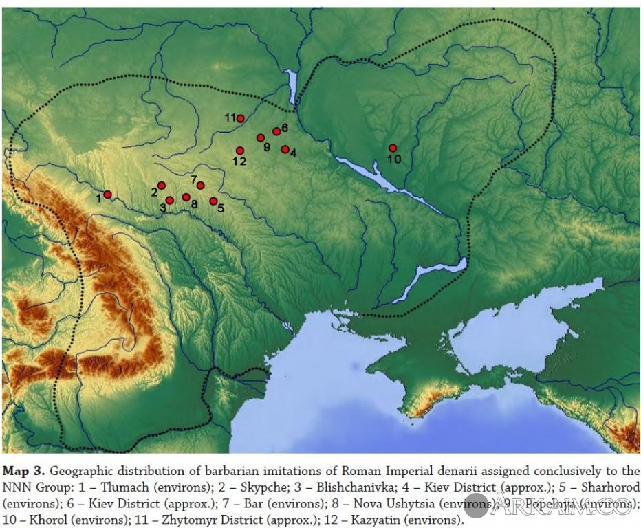 Олег Анохин писал, Находки «варварских» подражаний римским монетам на территории Украины и Молдо- вы можно разделить на три группы: 1. Подражания Пшеворской культуры, которые имитировали денарии Римской респуб- лики. Места основных находок: Ивано-Франковская, Львовская и Тернопольская область. Предположительное время чеканки: II-I вв. до н.э. Изготавливались из серебра и бронзы, пла- кированной серебром (рис. 1). 2. Подражания Черняховской культуры, которые имитировали ауреусы, денарии и анто- нинианы Римской империи. Места основных находок: Винницкая, Волынская, Житомирская, Ивано-Франковская, Киевская, Кировоградская, Львовская, Николаевская, Одесская, Пол- тавская, Ровенская, Тернопольская, Харьковская, Хмельницкая, Черкасская, Черновицкая об- ласти и Молдова. Предположительное время чеканки: II-IV вв. Изготавливались из золота, серебра, бронзы, бронзы, плакированной серебром и бронзы, плакированной золотом (рис. 2). 3. «Таманские денарии» [7, с. 33] которые получили своё название благодаря месту че- канки – Таманскому полуострову Краснодарского края России, имитировали денарии Римс кой империи. Ещё одно название данных подражаний - "денарий с типом идущего Марса".