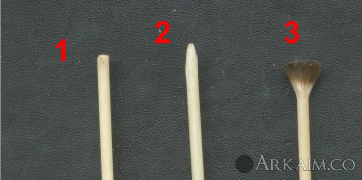 Всем доброго. Размещу и тут. Мало ли, может кто использует, но не знает "где взять" ;) Материал, издавна в быту известный как стекольные палочки или "кисточки под обжиг", и при очистке применяющийся уже давно (как в сочетании с шаберами, так и в качестве отдельного инструмента). ___________________________________________________________________________ Итак, - материал - с/пластик -длина - ~200 мм - толщина - 2 мм Варианты оформления кончиков: 1. – «условно плоский кончик» – ИСХОДНОЕ СОСТОЯНИЕ. Может использоваться для выравнивания поверхности после мех. очистки, очистки земли при небольших загрязнениях. 2. – заостренный кончик - При необходимости кончик легко поддается "доработке на шлифшкурке" до нужной формы. 3 Кисть - обжег кончик (1) на огне на нужный размер - распушил. Зачастую для создания нужной конфигурации кисти можно заострить кончик , предварительно пройдя этап (2).