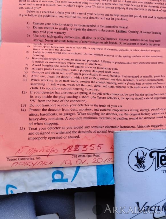 В розпал сезону, виставляю на продаж свій Tesoro Vaquero, як то кажуть прилад відомий і реклами не потребує. Але все ж таки, два слова скажу, як користувач цих приладів. ВАК, ковбой, або молодший брат борсука,під такими синонімами можна зустріти цю машину на форумах. Однотональний, аналоговий прилад професійного рівня, з ручним балансом ґрунтах і трешхолдом. З частотою пошуку 14.3, 14.5, 14.7 кГц, така частота оптимальна для дрібної металлопластики і дрібних цілей з олов'янистої бпонзи. Економічний, працює від крони до 12 годин непреривної праці, з навушниками більше 24. Легкий 1 кг, простий у використанні і експлуатації. Моно датчик 9 х 8 дюймів ідеально працює як снайпер на замітчених місцях і як штатний, для повсякденного пошуку. Завдяки унікальному запатентованому дискримінатору ЕD180, вражає своєю вибірковістю і інформативністюпри пошуку. Прилад в Україні з 2012 року, приплив з USA, коробка, доки все є. Додаю нову крону. Мінімальні люфти присутні, але не критичні, лікується фум стрічкою. Прилад працює справно, не топився, не розбирався, "модернізацій" не проходив. Звісно є сліди використання і часу, на ТТХ не впливає. Вуха на датчику цілі, не ломані, не клеяні. Дріт датчика як новий, без тріщин, сколів, еластичний. ВАК неодноразово радував знахідками по скіфам і кочевникам ЗО. Продаю без поспіху, у зв'язку з придбанням Tesoro Tejon і плюс маю ще один прилад. Обмін не цікавий. Відправлю вам,за ваш рахунок, зручним для вас перевізником (АР Крим і ОРДЛО не відправляю). Ціна 6.000 ua, без торгу. Переказ на карту ПБ, або післяплата. Деталі в приват, питання в темі. Дякую.