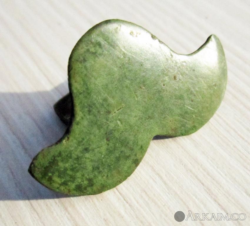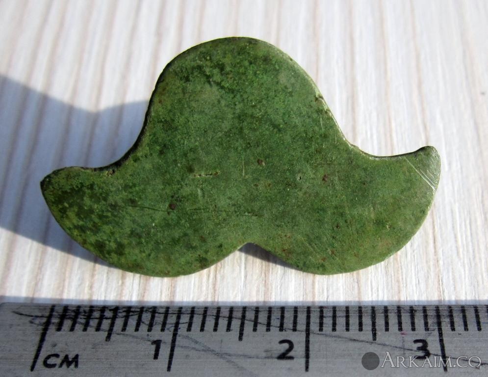 24. Приветствую. В лесу под катушку попалось, как я думаю, украшение упряжи. Частая находка по РИ, но после помывки появилась прелестная плотная, с блеском, малахитовая патина, подобная той, что бывает на бронзовых наконечниках стрел. В одном месте патина скололась- обнажив край меткерна. Вопрос: на сколько старый предмет и "конина" -ли это вообще? С уважением.
