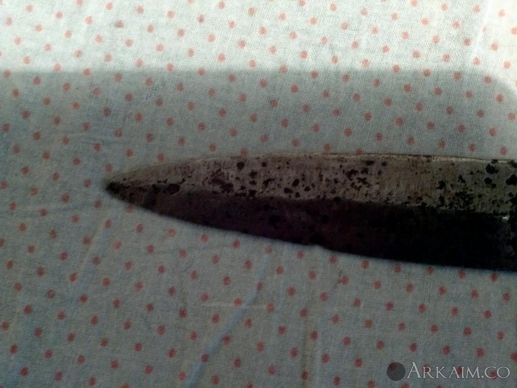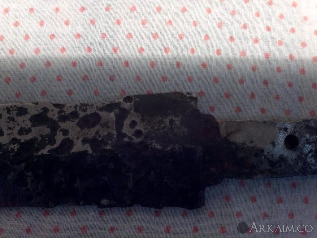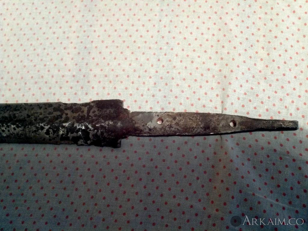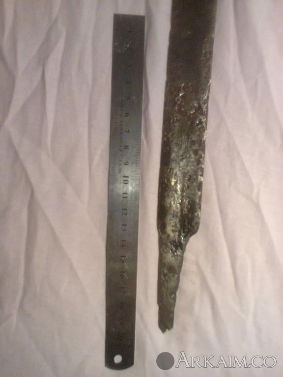 14. Предмет 41см в длинну с рукоятью, 4,5мм толщина метала . заточен с одной стороны .рукоять с потерей -но тоже по форме напоминает сакса ... Но насторожила выямка по всей длене клинка в полтора см ширины (типа кровостека) - по фото в гугле на саксах только тонкие полоски, насечки... А на этом с одной стороны ровный а с другой кровостек! причем у заточенной части в низу он толще . Подскажите к какому периоду отнести данный артефакт.с ув.