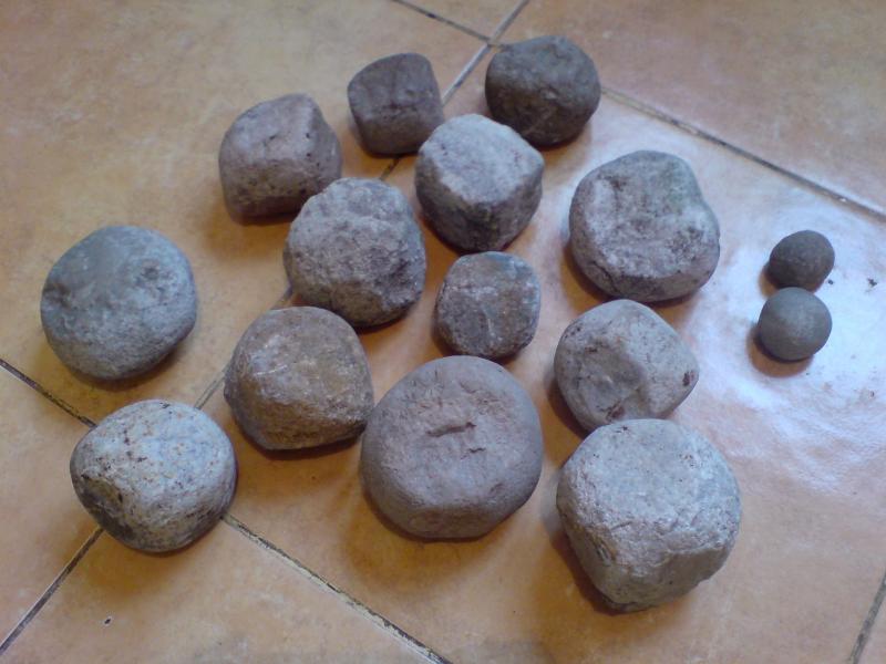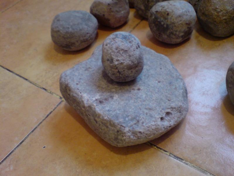 Коллеги, эти круглые шарики не терочники. Если б была хоть малейшая вероятность, что это терочники я бы их не выкладывал. Я на такие шарики обращаю внимание давно. Чаще они попадаються разломанные на части и обломками схожи с обломками пряслиц, особенно в пыли. Я вытащил с балкона несколько терочников и положил для сравнения с шариками. Посмотри на них, это совершенно разые вещи. Мысь о камнях для пращи пришла пару лет назад в Крыму, но для классической пращи использовались камни другой формы, овальные, немного вытянутные, так сказать. ОНи хорошо описаны в литературе. Может наши местные скифоидные племена и метали такие вот шарики в своих враждебных соседей, бог его знает. Еще очень похоже, что они глиняные. Слишком полированные, глянцевые, как бильярдные шары. Затереть вручную твердую породу так невозможно.