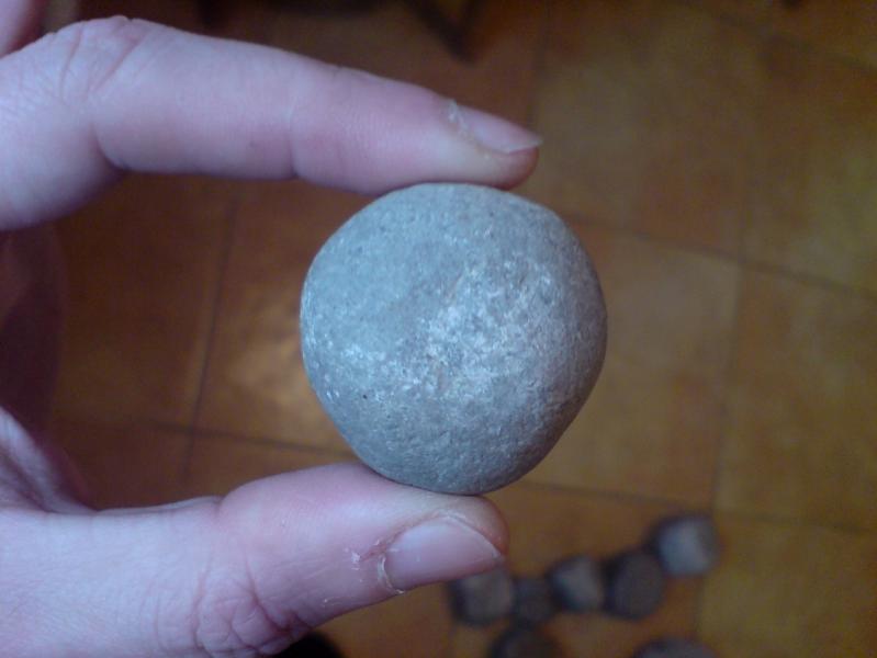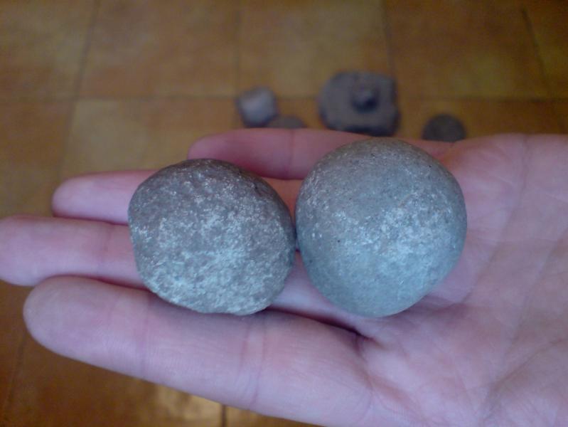 Есть такое дело у Шрамко, огромное СПАСИБО! Yorik совершенно верно, шарики именно глиняные. Они такие глянцевые со всех сторон из-за гладкой формы в которую их вжимали, а место приложения силы вжима - выщербленное, с деформацией и от этого места идут трещины. И так повторяется на всех шариках которые попадаются - полностью гладкие, но у всех есть место с деформацией. Итог - камни для пращи.