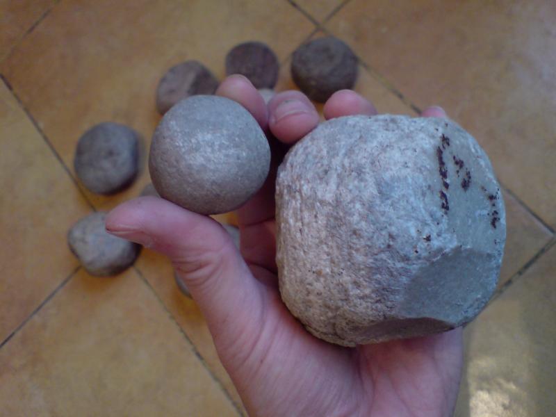 Срвершенно верно, они каменные! Сегодня в парке, в клубе коллеги смотрели эти шарики - из 8 человек, одно мнение - терочник и семь - камни для пращи. Именно камни, а не глина. Один из коллег, заметил, что во время раскопок одного из скифских поселений, археологам попался пробитый череп, внутри которого был такой точно камешек. Еще было озвучено мнение, что такие гладенькие круглые камешки попадаються в карьерах, причем в весьма не малом колличестве.