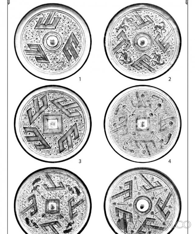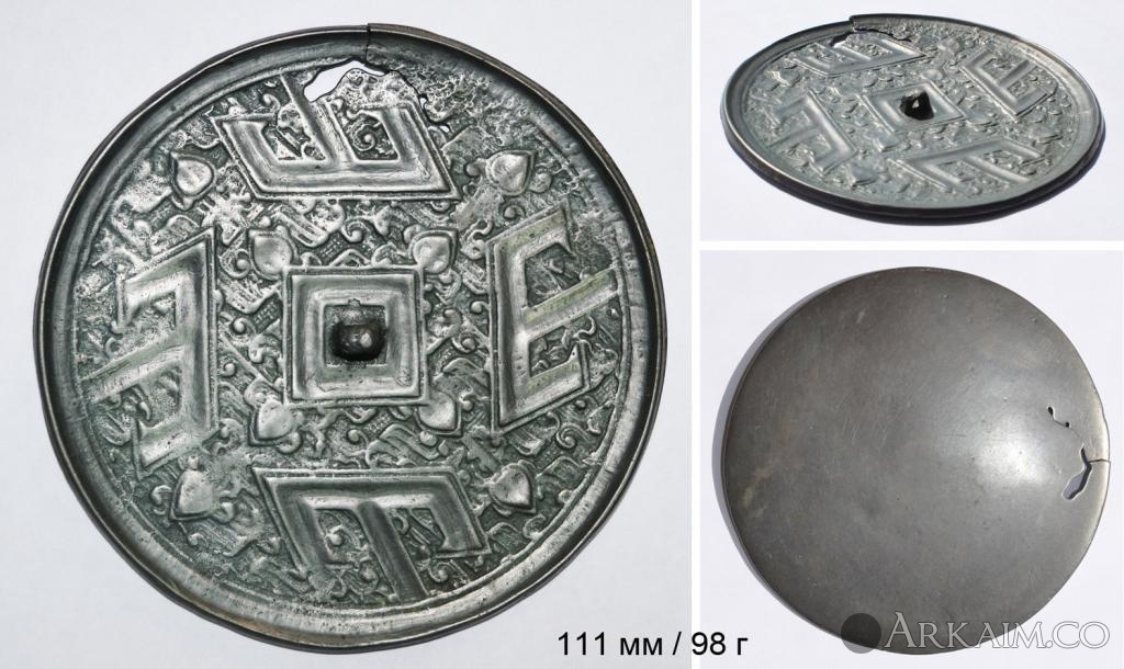 Вероятно надо смотреть ранние зеркала прим. 3-2 в до н.э. , с Ш-образным орнаментом. Покажите Dozer-у. Может он найдёт аналогии. И это не серебро. У предметов познескифского(хуннского) периода патина серая и светло-серая, похожая на серебро/свинец. Покорябайте-там желтый металл.