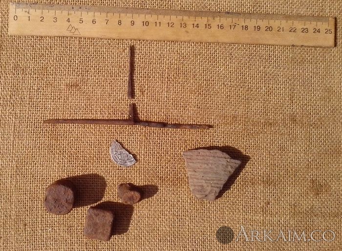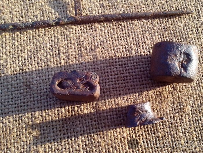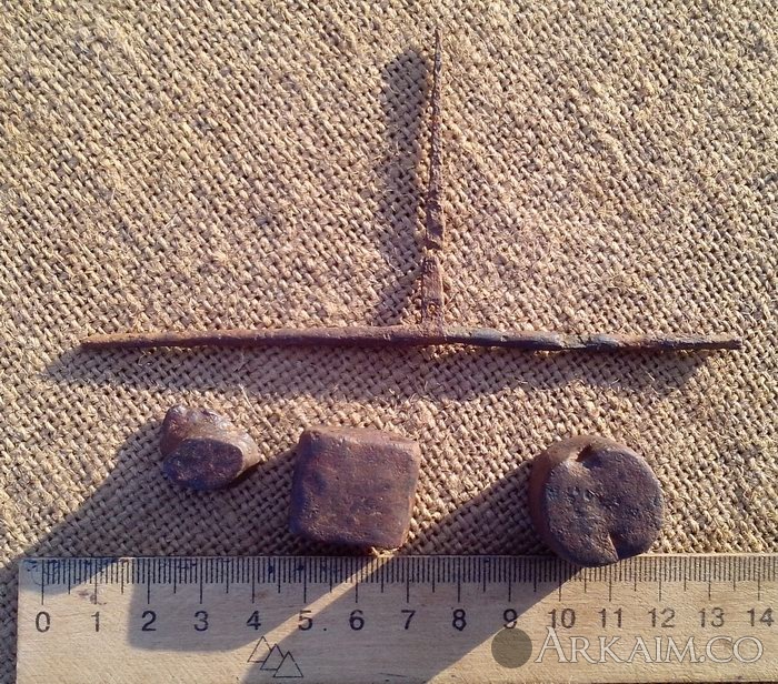 2. Здравствуйте. Вот, копнул с одной ямки, Харьковская обл. Может вот та штуковина, что на фото выше весовых гирек, быть весами? Были еще какие то кусочки тоненькой бронзы, но они рассыпались в руках. С ув.