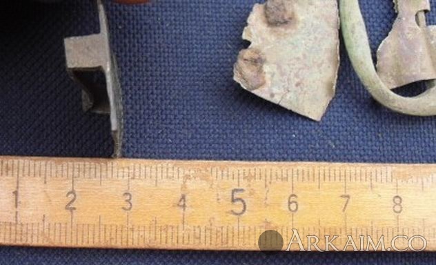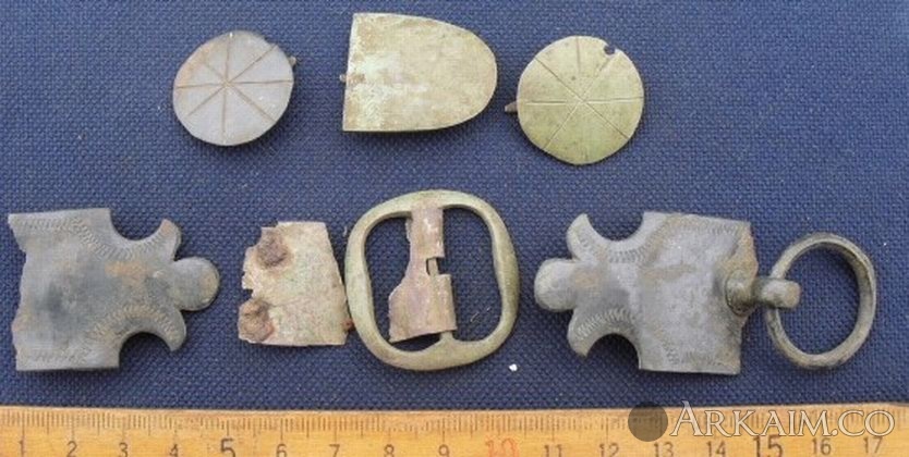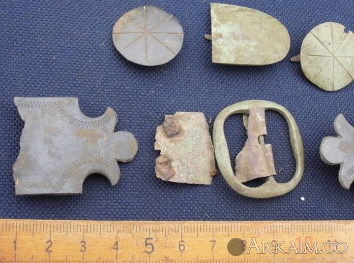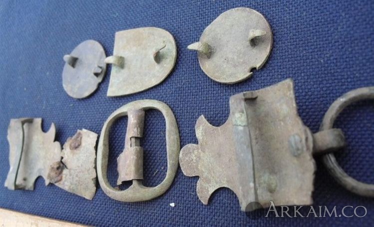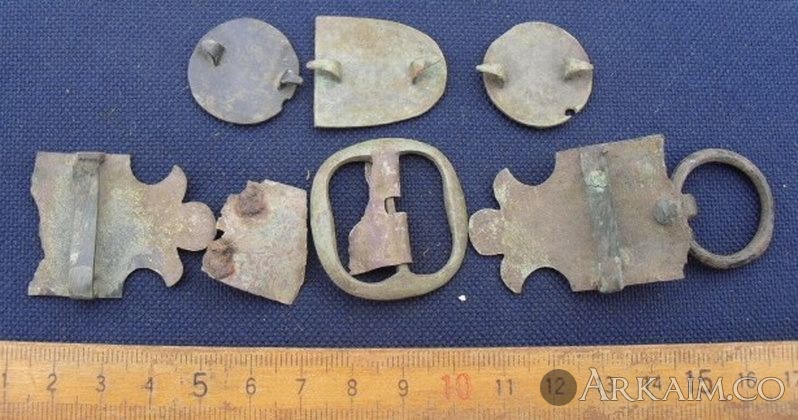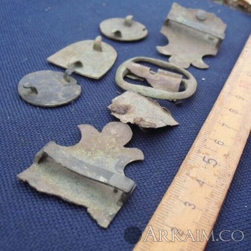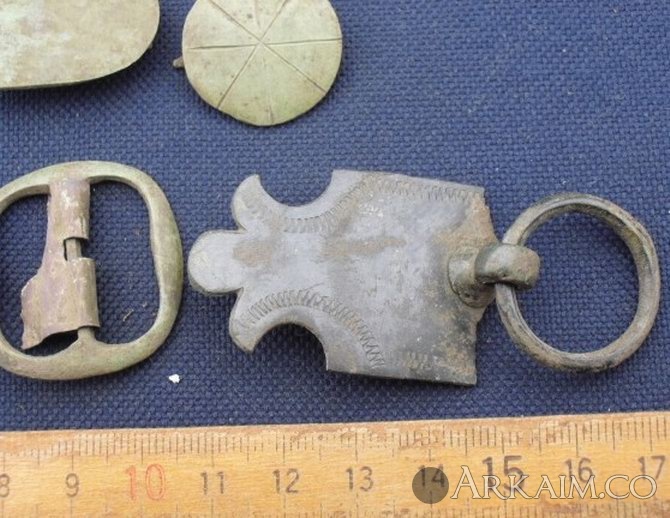 9. Здравствуйте. Попалось вот, в лесу. Харьковская обл. Материал - бронза. Часть деталей покрашена черной краской (эмаль ?). Все было в радиусе см 50. На конину вроде хлипкое, может с пояса? Подскажите по датировке.С ув.