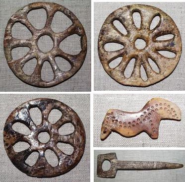 костяные "Солярные колеса", фигурка животного и жезл со стоянки "Сунгирь" ок 28 000 до н.э.