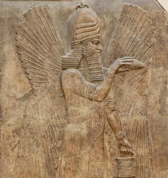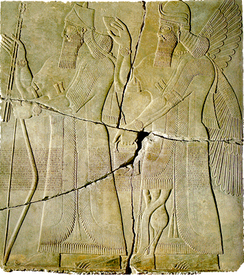 Рельеф с изображением ассирийского царя Ашшурнасирапала II в сопровождении божества-хранителя происходит из дворца, построенного по его велению в начале IX в. до н.э. в новой столице Ассирийской империи городе Калах. Монументальные рельефы высотой 2,5 метра покрывали стены залов огромного дворца, открытого одним из первых энтузиастов восточной археологии Лэйярдом в середине XIX века на холме Нимруд. В образе царя, держащего лук и стрелы - атрибуты воина, воплощена идея силы правителя могущественной державы. Бог-хранитель, наделенный столь же мощной мускулатурой, держит в руках ведерко и шишку пинии - предметы культа. Клинописный текст, нанесенный по ошибке прямо поверх фигур, повествует о завоевательных походах Ашурнасирапала II."
