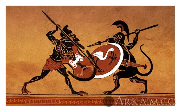 Yorik Опубликовано 28 декабря, 2015 Опубликовано 28 декабря, 2015 Батрахомиомахия» (bάτρaχος, лягушка, μῦς, мышь, μάχη, борьба) — поэма, пародирующая мотивы гомеровского эпоса. Приписывалась в разное время самому Гомеру, а также Пигрету Галикарнасскому и неизвестному автору эллинистического времени. Наиболее известные переводы принадлежат В. А. Жуковскому (1831) и М. С. Альтману (1936). В поэме спародированы мотивы гомеровского эпоса. Поводом для войны становится то, что царь лягушек Вздуломорда неумышленно утопил мышонка Крохобора, которого перевозил на своей спине. Как и у Гомера, на различные стороны в конфликте становятся боги Олимпа. В конце концов, после временного успеха мышей, лягушки, с помощью посланных Зевсом раков, одерживают победу. Ныне преобладает точка зрения на Батрахомиомахию как произведение эллинистического времени. «Батрахомиомахия» считается прообразом европейской литературы бурлеска, включая Теофило Фоленго (поэма «Москеида»), Лопе де Вега («Котомахия»), Георга Ролленхагена. На этот же образец ориентировалась героикомическая поэма Нового времени начиная с «Похищенного ведра» Алессандро Тассони (1622). В переносном смысле «батрахомиомахия» или «война мышей и лягушек» означает столкновение по ничтожному поводу (обычно столь же ничтожных соперников). Текст приводится по изданию: «Античный мир и археология». Вып. 1. Саратов, 1972. С. 154—162. Перевод и комментарии профессора В. Г. Боруховича ПРИМЕЧАНИЯ * «Батрахомиомахия» (от др.-греч. batrachos [лягушка], mus [мышь], mache [борьба]) — поэма, пародирующая мотивы гомеровского эпоса. Приписывалась в разное время самому Гомеру, а также Пигрету Галикарнасскому и неизвестному автору эллинистического времени. Наиболее известные переводы принадлежат В. А. Жуковскому (1831) и М. С. Альтману (1936). — Прим. ред. 1 Перевод выполнен с издания: Hymni homerici accedentibus epigrammatis et Batrachomyomachia, ex rec. Aug. Baumeister, Lipsiae, 1888. 2 Вторичное появление Горшколаза на поле брани после того, как была описана в ст. 208 его гибель, иногда объясняют тем, что автор поэмы пародирует «Илиаду», в которой встречаются подобные промахи. 1 К вам, Пиерийские Музы, живущим в горах Геликона, 2 Ныне с мольбой обращаюсь, слагая новую песнь! 3 Вот уж лежит на коленях, на воском покрытых дощечках, 4 Песнь об ужаснейшей битве, неистовом деле Ареса. 5 Смертному роду людскому я в ней обещаю поведать, 6 Как воевали с лягушками мыши, как в подвигах бранных 7 Равными стали гигантам, Землею рожденным (об этом 8 Люди твердят повсеместно). Начало же было такое. 9 Некий мышонок, от ласки сбежав, замученный жаждой, 10 Остреньким рыльцем припал к воде в близлежащем болоте, 11 Радуясь влаге медвяной. Заметил его тут болтливый 12 Луж обитатель, со словом крылатым к нему обратился: 13 «Кто ты, чужак? От кого происходишь? Из стран ли далеких 14 Прибыл сюда? Расскажи мне всю истину, все без утайки! 15 Если в тебе отыщу я достойного друга, то в дом свой 16 Тотчас тебя поведу — и с дарами богатыми будешь. 17 Я же зовусь Щекодувом, великим царем нарекаюсь: 18 Чтят лягушата всей лужи во мне скиптроносного мужа. 19 Сам Грязевик мне родитель, который с царицею Водной 20 В пылкой любви сочетался на топких брегах Эридана. 21 Видно, и ты не простой, а прекрасной и знатной породы: 22 Не от царей разве ты скиптроносных и в подвигах славных 23 Род свой ведешь? Так скорей расскажи нам и точно поведай!». 24 Так, отвечая, сказал Крохо