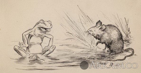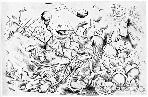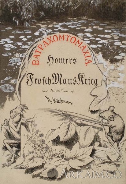 Yorik Опубликовано 28 декабря, 2015 Автор Опубликовано 28 декабря, 2015 Теодор Киттельсен - Рисунки к поэме "Батрахомиомахия" ("Гомеровская война мышей и лягушек. Батрахомиомахия"; Homers froske- og musekrig. BATRACHOMYOMACHIA), 1885 01. Титульная страница. Гомеровская война мышей и лягушек. Батрахомиомахия 02. Царь Вздуломорда обращается с речью к мышонку Крохобору. 03. Крохобор плывёт навстречу гибели на спине у царя Вздуломорды. 04. Глашатай Горшколаз объявляет лягушкам войну. 05. Сражение 06. Лягушонок, играющий на арфе; заключительная виньетка к "Войне мышей и лягушек" "В отличие от обилия переводов поэмы, нельзя похвастать обилием доступных рисунков Т.Киттельсена. Из 14 имеющихся в природе рисунков Гётеборгский Музей искусств выложил из своих фондов на всеобщее обозрение в сети только четверо, видимо для того, чтобы за остальными десятью желающие приехали и посетили музей лично. Еще один (заключительный рисунок серии) любезно предоставил нам Leif Østby в своей книге «Теодор Киттельсен. Рисунки и акварели». Вот что он пишет: "...Каким-то образом, никогда ясно не объяснённым, он [Киттельсен] случайно наткнулся на античную, ироикомическую поэму «Batrachomyomachia» или «Война мышей и лягушек», пародию на гомеровскую «Иллиаду». Его четырнадцать рисунков пером (1885) представляют интерес как первая киттельсеновская законченная серия иллюстраций. Они пришлись по душе художественному миру, выставлялись в Мюнхене, а некоторые из них были опубликованы в «Allgemeine Zeitung». Впоследствии их купил шведский коллекционер Понтус Фюрстенберг (Pontus Furstenberg), и в конце концов они оказались в Гётеборгском (Göteborg) Музее искусств. Мастерство Киттельсена подмечать человеческие черты у животных раскрывается с огромным юмористическим содержанием, а батальные сцены изображаются с огромной стремительностью и живостью. Заключительная виньетка, где лягушонок перебирает струны своей арфы и рассказывает историю битвы с чувством драмы и пафоса, напоминающим знаменитое вергилиевское «arma virumque cano», выполнена с превосходным трагикомическим эффектом". Итак, у нас имеется пять из четырнадцати рисунков Т.Киттельсена к рассматриваемой поэме. Желающие увидеть остальные рисунки могут либо поехать в Гётеборг, либо постараться раздобыть 37-й номер стокгольмского журнала "Ord och Bild" ("Слово и Иллюстрация") за 1928 год. Также данные рисунки могут быть обнаружены в книге "Theodor Kittelsen i tekst, tegninger og malerier", Oslo 1945 (перездание в 1950). О чём ещё стоит подумать: Leif Østby говорит о рисунках пером (и приводит заключительную виньетку именно в такой технике исполнения), а Гётеборгский Музей искусств выкладывает нам рисунки тушью и акварелью...(?!) В разные времена "Батрахомиомахия" приписывалась различным авторам. Как видно по титульному рисунку Т.Киттельсена, в его бытность авторство поэмы приписывалось самому Гомеру. Сейчас это уже далеко не так"