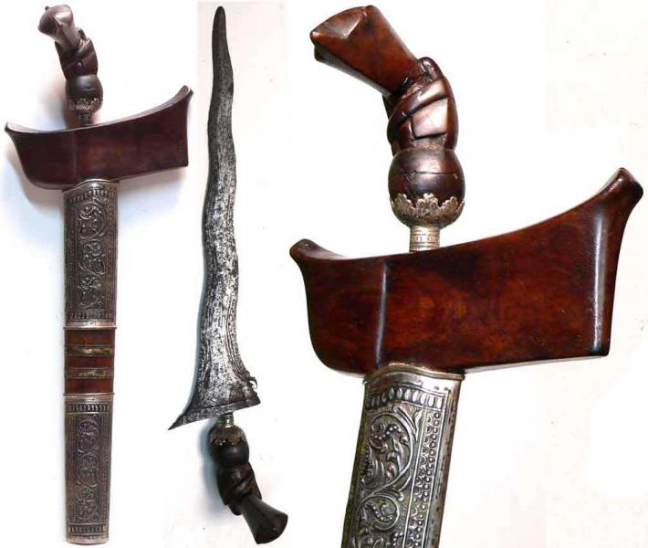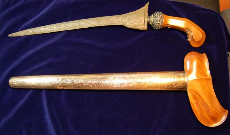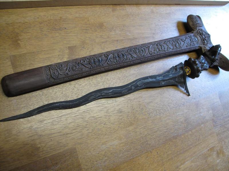 Taras Опубликовано 3 апреля, 2013 Автор Опубликовано 3 апреля, 2013 (изменено) Теперь немного об одном из наиболее любимых мной видов этнического оружия - KRIS (KERIS). Это национальный кинжал, распространённый на всей территории Индонезии, Филиппин и в Малайзии. Оружие магическое, мистическое, с которым связано огромное количество культов и поверий. В жизни яванцев, например, крис играл настолько важную роль, что, при определённых условиях, запросто мог заменить на свадьбе собственного хозяина-жениха. Считалось, что существуют разновидности крисов, способные: звенеть в ножнах, предупреждая владельца об опасности; будучи направленные остриём в сторону пожара - отводить последний; исторгать из себя воду; материализовать рой разъярённых пчёл; летать по воздуху; насылать несчастья и болезни. Крис старались не вынимать без повода из ножен и не указывать ни на кого обнаженным остриём, дабы не натворить лиха. Возник крис на Центральной Яве в 14 веке. Это - колющее оружие, конструктивно характерное тем, что штырь клинка свободно вращается в рукояти. Данное обстоятельство сформировало специфическую технику ведения боя крисом. Исполнение рукояти и ножен отличается в различных регионах. Рукоять чаще всего была деревянной, но встречаются варианты в металле. Как правило, рукоять имеет «пистолетную» форму, благодаря которой кинжал очень удобно держать в руке. В разных районах оформление рукояти производилось по-своему: в одних регионах это были простые в исполнении деревянные, украшенные резным растительным орнаментом, либо продольными желобками, в других — рукоять делалась в виде фигурок животных, птиц, богов. У основания рукояти на хвостовик навинчивалась чашевидная гайка, украшенная либо геометрическим орнаментом, либо орнаментом в виде цветка лотоса, считавшегося священным. Ножны изготавливались из дерева. Они состояли из двух частей — длинного канала ножен для основной части клинка и широкого чашеобразного устья для пяты клинка. Форма этой чаши также варьировалась в зависимости от района изготовления. Характерная черта клинка криса — ассиметричная пята, резко расширяющаяся возле рукояти. К пяте клинка крепилась полоска металла — «ганджа». Она изготавливалась отдельно из того же куска металла, что и клинок на ранней стадии закалки, а затем насаживалась на хвостовик клинка и приваривалась настолько плотно, что очень часто кажется с клинком одним целым. В клинке делались два небольших углубления для большого и указательного пальца, а с одной стороны пяты формировались небольшие шипы. Клинок может быть прямым и пламеневидным, изогнутым. Если клинок волнообразный, то число изгибов всегда делалось нечётным. Чаще всего встречаются клинки с 7 и 13 изгибами. Прямые и изогнутые клинки характерны для различных регионов. Изменено 3 апреля, 2013 пользователем Taras
