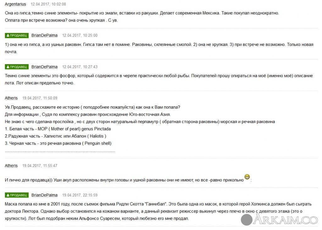 Yorik Опубликовано 23 апреля, 2017 Опубликовано 23 апреля, 2017 Очень веселый лот. Одни ушные раковины акул чего стоят! Маска ушные раковины акулы Материал: ушная раковина Описание: Высота 19 см, ширина 14 см. Изготовлена из ушных раковин акулы. Размеры примерно с детское лицо. Ссылка на аук, где они продаются... http://www.ebay.com/sch/-/35806/i.html?_nkw=stone+mask
