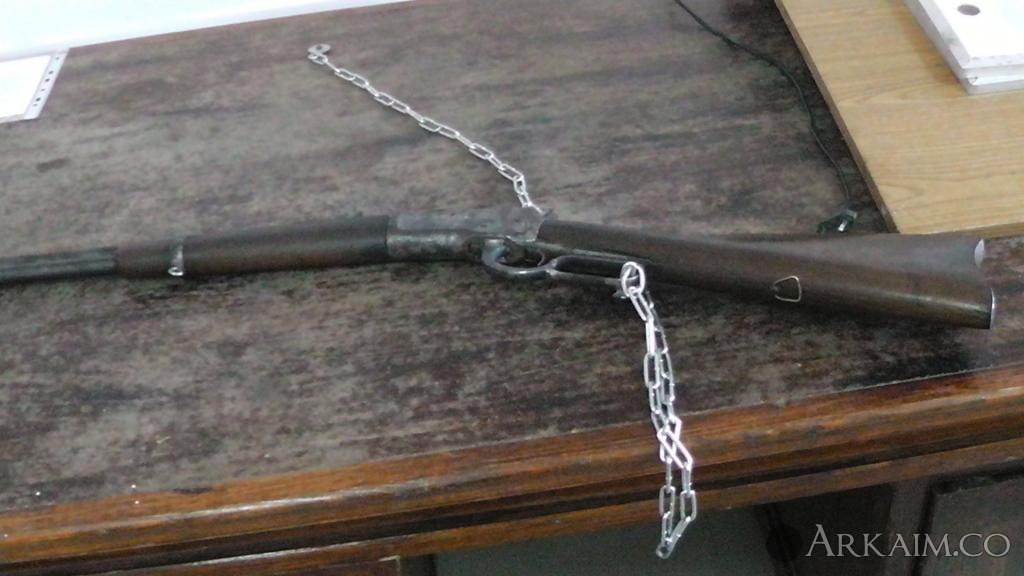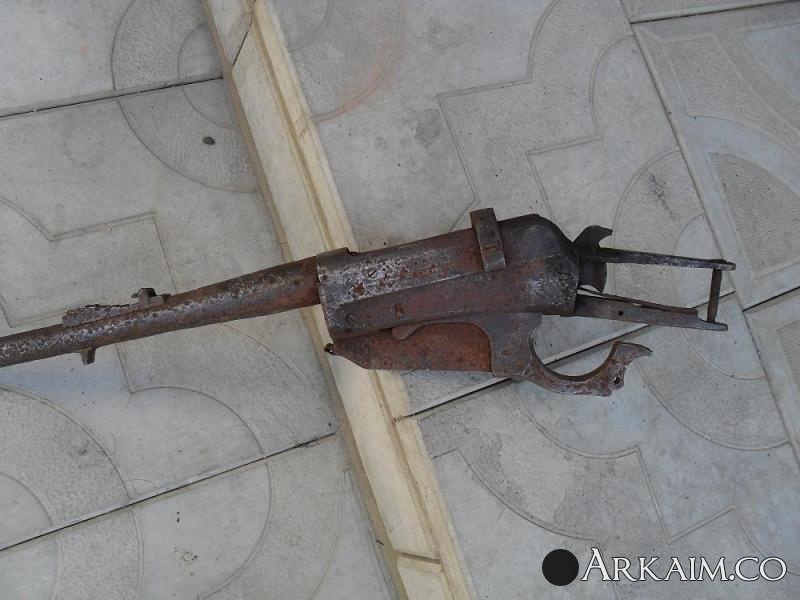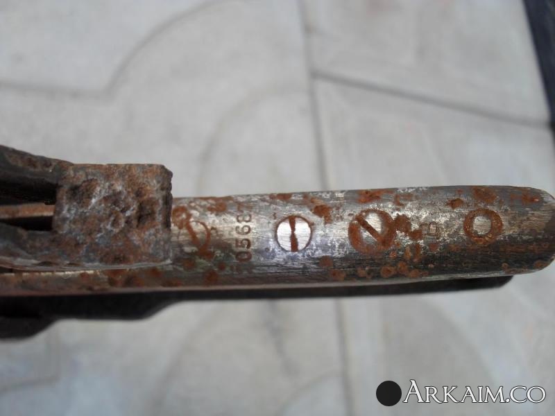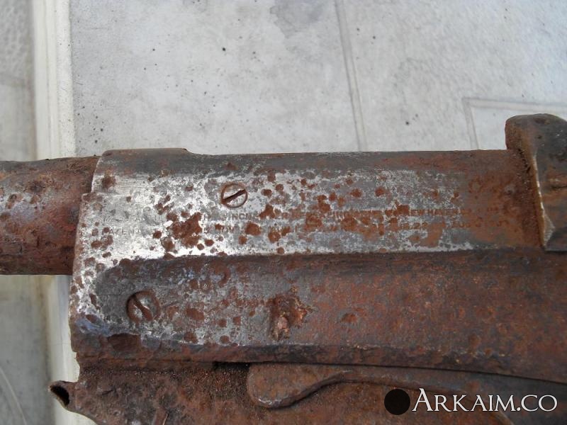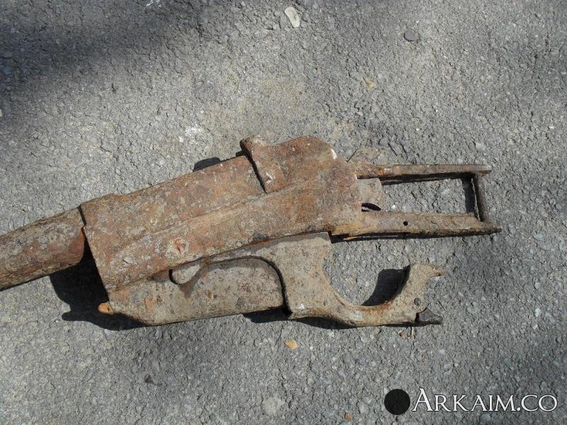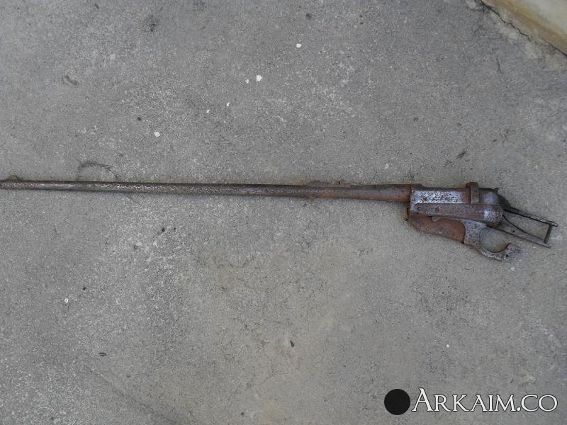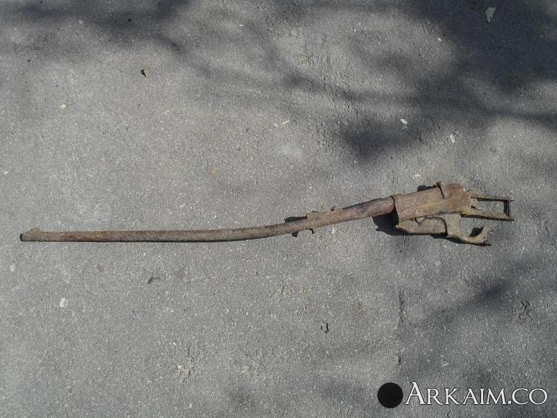 Среди поля в окружении наконечников :D "выскочила" американская- для русской армии под патрон 7.62-"палка". Ржавая да гнутая. От я с ней в итоге и намучился. :huh: Почистить и выровнять получилось. Расписной шо газета :D .А дальше дело не пошло. Не нравится мне с оружием возится. Болты не выкручивались, ВДэха не помогала. Даже паяльной лампой нагревал с последующим контрастным душом :D (да простять меня любители оружия) -не помогло. Винтики и болтики так и остались намертво на своих местах. Коротче-железо победило. :angry: Макет не получился." Розпустил" болгаркой ствол и сменял на скифский наконечник копья.