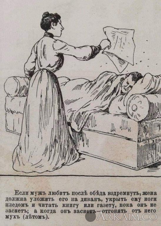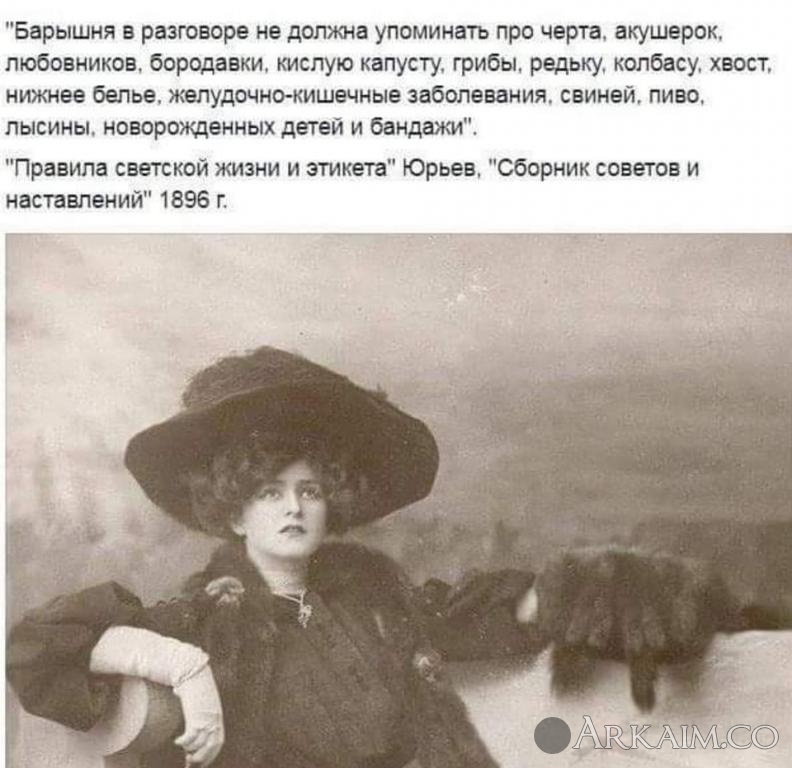 Yorik Опубликовано 21 мая, 2019 Автор Опубликовано 21 мая, 2019 Барышня в разговоре не должна упоминать про черта, акушерок, любовников, бородавки, кислую капусту, грибы, редьку, колбасу, хвост, нижнее белье, желудочно-кишечные заболевания, свиней, пиво, лысины, новорожденных детей и бандажи. Смех и слезы светской красавицы должны быть красивы и изящны. Смех должен быть не громкий, но рассыпчатый. При плаче можно уронить не более трех-четырех слезинок и наблюдать, чтобы не испортить цвет лица. Ложиться спать молодой женщине следует около часа ночи. В постели - перелистывать французский роман. Засыпая, ни о чем грустном, неприятном и тяжелом не думать, в особенности об убийцах, нищих, мышах, пауках, привидениях, сиротах, страшных болезнях и пожарах. Следует помнить, что спокойная совесть - лучшее средство для спокойного сна. Видеть непристойные сны - совершенно неприлично молодой даме. В подобном случае ей следует, отнюдь не увлекаясь любопытством посмотреть, что будет дальше, немедленно проснуться и повернуться на другой бок. "Правила светской жизни и этикета. Хороший тон. Сборник советов и наставлений". Выпущено в 1896 году в Типо-Литографии А. Якобсон, Санкт-Петербург.