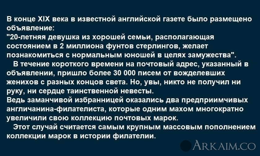 Yorik Опубликовано 12 мая, 2019 Автор Опубликовано 12 мая, 2019 ОБРАЗЧИК ИЗЯЩНОЙ СЛОВЕСНОСТИ... ИЛИ...БРАЧНЫЕ ОБЪЯВЛЕНИЯ СТОЛЕТНЕЙ ДАВНОСТИ-УЧИТЕСЬ!!! - Барышня, светлая блондинка, очень хорошенькая и стройная, хотела бы выйти замуж. Предупреждает, что имеет «грех». - Унтер-офицер желал бы сочетаться брачными узами с девицей, имеющей свой капитал. Свадьба за счет невесты. - Только что кончившая гимназию девица желает выйти замуж за холостого и бездетного вдовца с состоянием. Возрастом не стесняться. - Вдовец 42 лет желает жениться на девушке «без прошлого». Образованный, знает музыку. Теща нежелательна. - Молодой человек 19 лет с титулом князя имеет 100 тысяч капитала, желает найти себе молодую девушку, интеллигентную, с капиталом от 50 тысяч. - 21 год, простого звания, с незапятнанным прошлым, с приданным в 800 рублей, хорошая работница и веселого нрава, поссорившись с женихом Алексеем, желает обязательно выйти замуж за солидного непьющего человека. P.S.Вдогонку…. Приглашение на свадьбу от еврейской мамы: "С сожалением вы приглашаетесь на свадьбу моего превосходного сына врача и какой-то голодранки, имя которой я не запомнила. Самая большая катастрофа в истории нашей семьи состоится в 9 вечера, в субботу, 8 сентября."