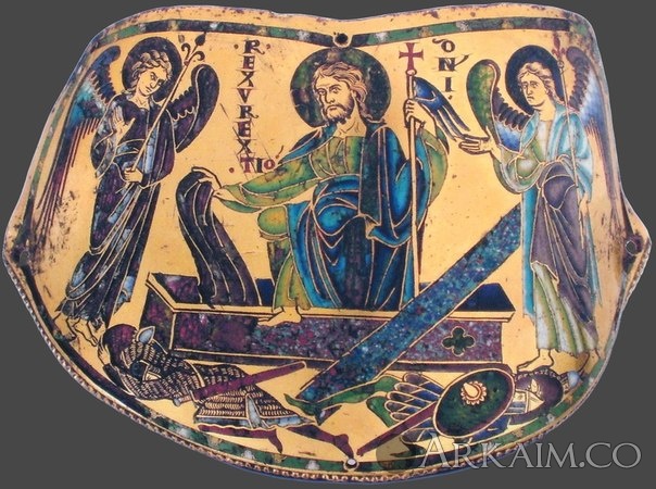 adc Опубликовано 24 апреля, 2014 Опубликовано 24 апреля, 2014 (изменено) Воскресение Христово. Наплечник Андрея Боголюбского; XII в.; местонахождение: Франция. Париж. Музей Лувр (фр. Musée du Louvre); 14.7 x 11.8 см.; материал: металл медь, эмаль; техника: золочение, эмаль выемчатая, эмаль перегородчатая. Инфа из сети, смущает, что все по латыни, Может просто не его!? Изменено 24 апреля, 2014 пользователем adc