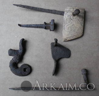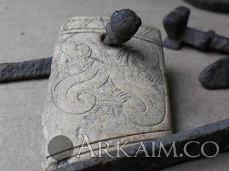 Давно, на Виолити, выставлял на определение находку- костяную пластинку с рисунком и с металлическим крепежом. Определить не удалось. Предполагалось, что это детали сундука или т.п.. ...т.е. сомнения остались. Просматривая аук наткнулся на лот- http://auction.violity.com/1797373-kolchan-v-sbore-kochevniki